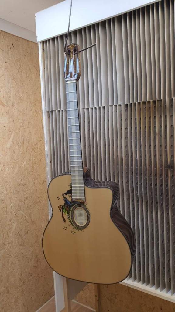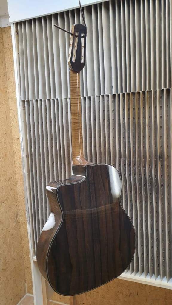 Gypsy Swing-guran, då? Jodå, sista slipningen är gjord och det sista lagret nitrocellulosalack kom på plats i början av veckan. I nästa vecka ska gitarren poleras upp och förses med stränghållare, sadel och stämskruvar – sedan bär det iväg från Frankrike till sitt blivande hem i Stockholm. Spännande. Jag är redo.