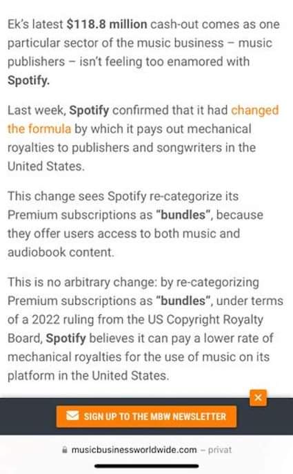 Och som om inte detta vore nog, kan Music Business Weekly i torsdagens nyhetsbrev berätta att Daniel Ek (en av de två skaparna av Spotify och vd för Spotify), sålt av små delar av sina aktier i Spotify under hösten 2023.